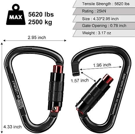 【Super Lightweight】Weighs only 3.17 oz each, these ice climbing carabiners are prefect for minimizing the weight of your gear during any adventure。Made of aircraft grade aluminum, you’ll enjoy using these durable and rustproof large climbing carabiners for long time.