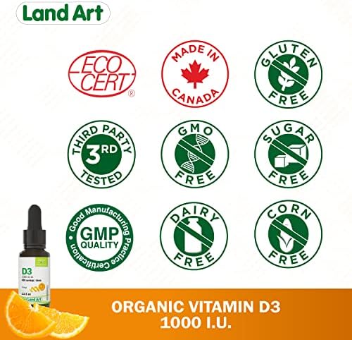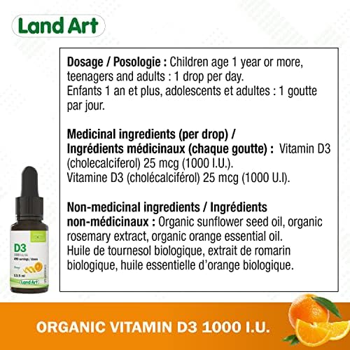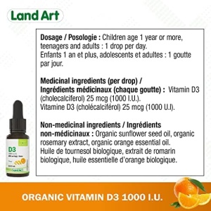 In Canada, it is impossible to get enough vitamin D from sunlight. The Organic Vitamin D3 from Land Art is recommended to address this potential deficiency. It is particularly recommended during the winter months for the entire population and year-round for people over the age of 50.