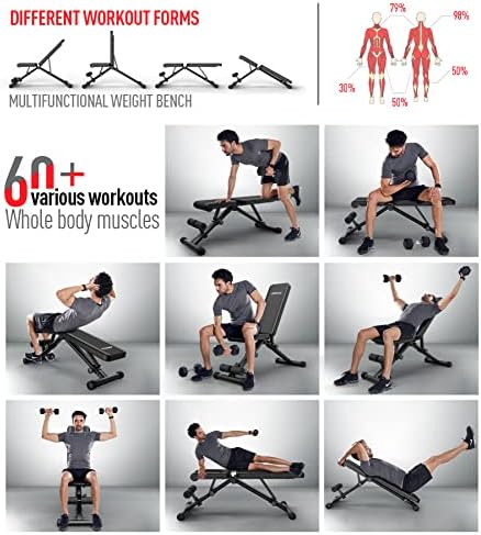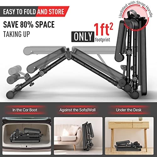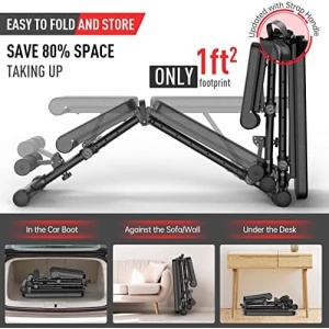 【Foldable & Save Space】 With the one-knob folding design, this foldable workout bench can be easily tucked away in storage when not in use to save space. After completing the workout, you can fold it and put it in a corner or under desk, saving more than 80% space and creating more accessibility in the room.